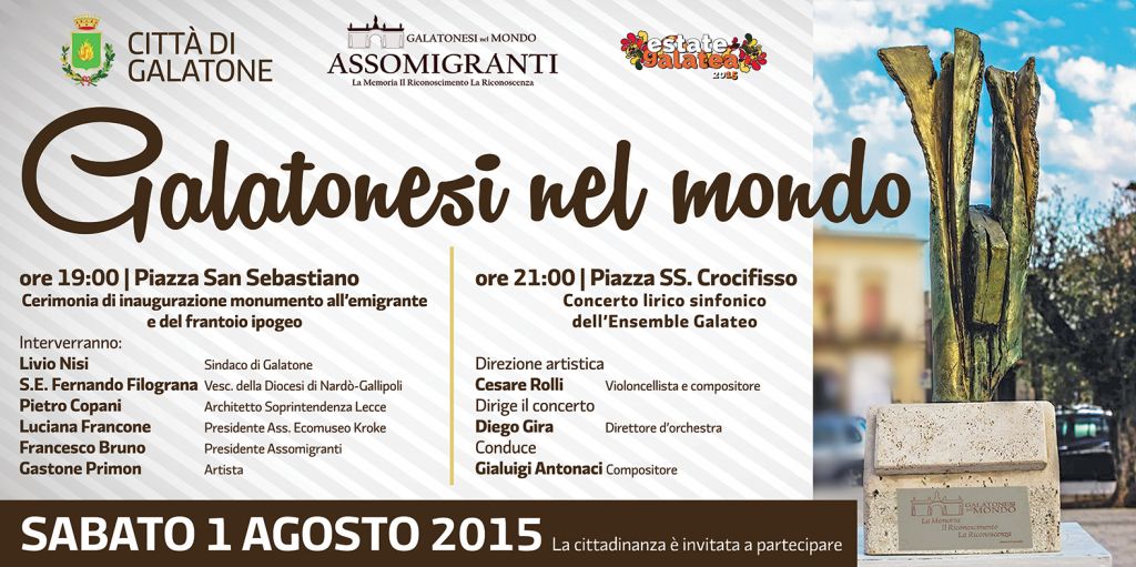 1 agosto - Inaugurazione monumento all'emigrante e frantoio ipogeo - Piazza San Sebastiano