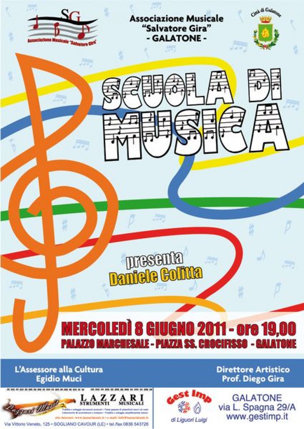 A conclusione del laboratorio musicale organizzato dall'Associazione Musicale "Salvatore Gira", mercoledì 8 giugno alle ore 19:00 presso il Palazzo Marchesale, avrà luogo un concerto finale dei ragazzi che hanno partecipato ai laboratori musicali; la manifestazione, sponsorizzata dall'Amministrazione Comunale, è presentata da Daniele Colitta.