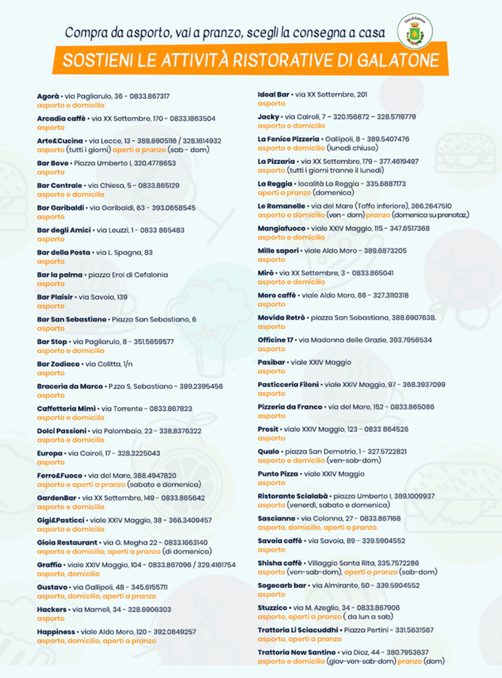 ELENCO ATTIVITÁ RISTORATIVE D’ASPORTO DELLA CITTA DI GALATONE
