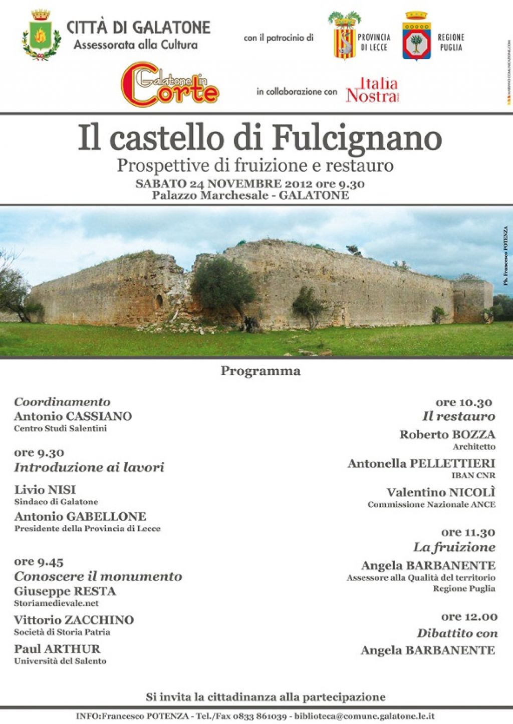 Sabato 24 novembre alle ore 9.30 presso il palazzo marchesale si terrà il convegno "Il castello di Fulcignano. Prospettive di fruizione e restauro". Introducono i lavori il sindaco Livio Nisi, il presidente della Provincia di Lecce Antonio Gabellone. Giuseppe Resta Storiamedievale.net, Vittorio Zacchino della Società di Storia Patria e Paul Arthur dell'Università del Salento interverranno su "Conoscere il monumento". Roberto Bozza Architetto, Antonella Pellettieri IBAN CNR e Valentino Nicolì Commissione Nazionale ANCE tratteranno il tema " Il restauro". Angela Barbanente Assessore alla Qualità del Territorio Regione Puglia interverrà su " La Fruizione". Al termine degli interventi vi sarà un dibattito con l'Assessore Regionale Angela Barbanente. Coordina il convegno Antonio Cassiano del Centro Studi Salentini.