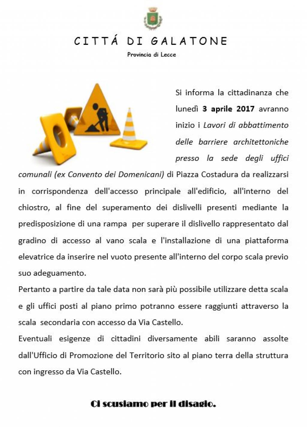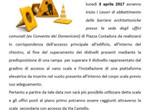 Si informa la cittadinanza che lunedì 3 aprile 2017 avranno inizio i lavori di abbattimento delle barriere architettoniche presso la sede degli uffici comunali (ex Convento dei Domenicani) di Piazza Costadura.