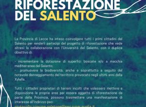 La Provincia di Lecce intende procedere ad una prima individuazione, tramite manifestazione d'interesse, delle aree pubbliche o private potenzialmente idonee e disponibili ad essere oggetto di interventi di rigenerazione agro-ecologica e/o riforestazione, quali parti di un progetto organico destinato alla realizzazione di corridoi agro-ecologici attraverso il territorio provinciale ed in connessione con la rete ecologica regionale.