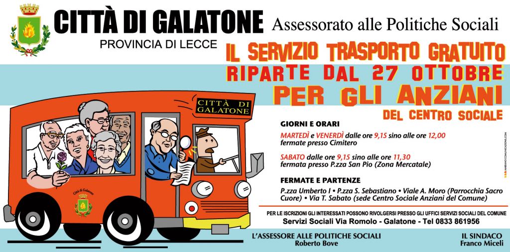 Riparte il 27 di Ottobre il Servizio Trasporto Urbano nel Comune di Galatone. Il servizio totalmente gratuito, promosso dall’Assessorato alle Politiche Sociali, è rivolto agli anziani del Centro Sociale e si effettua nei giorni di Martedì e Venerdì dalle ore 9.15 alle ore 12.00 per recarsi al cimitero ed il giorno di Sabato dalle ore 9.15 alle ore 11.30 per recarsi in piazza mercato.