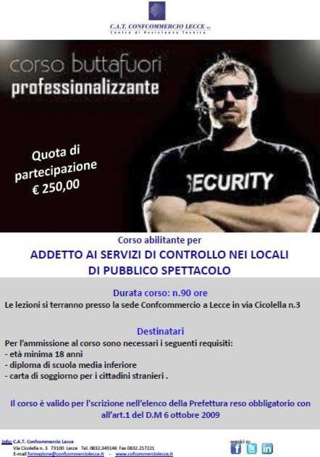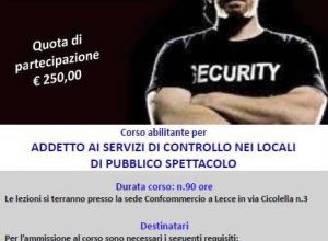 Il corso di formazione per “Addetti ai servizi di controllo delle attività di intrattenimento e di spettacolo in luoghi aperti al pubblico o in pubblici esercizi” (D.M. 6 /10/2009 e s.m.i.), organizzato dal C.A.T. Confcommercio Lecce e approvato dalla Regione Puglia, consente di conseguire l’abilitazione per l’esercizio dell’attività e ha validità sull’intero territorio nazionale.