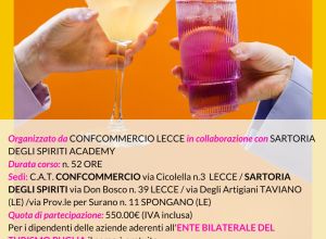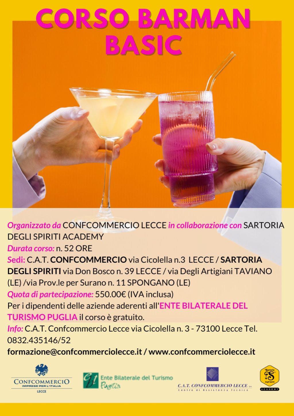 INIZIO venerdì 27 NOVEMBRE 2023 per la nuova edizione del corso di formazione professionale per BARMAN organizzato da  C.A.T. Confcommercio Lecce in collaborazione con “SARTORIA DEGLI SPIRITI”.