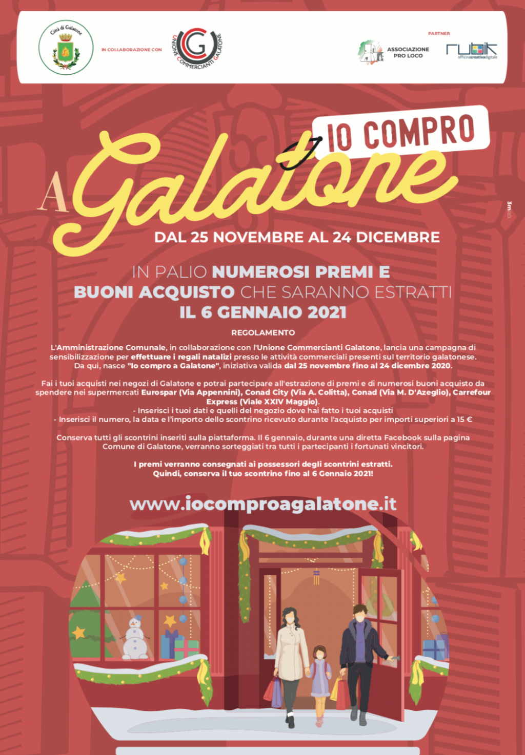 L'Amministrazione Comunale, in collaborazione con l'U.C.G. Unione Commercianti Galatone, lancia una campagna di sensibilizzazione per effettuare i regali natalizi presso le attivitaฬ commerciali presenti sul territorio galatonese. Da qui, nasce "Io compro a Galatone".