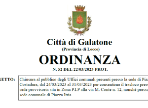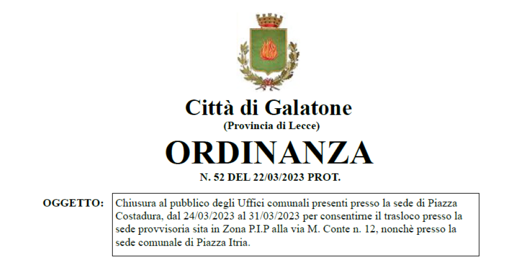 la chiusura al pubblico degli Uffici comunali presenti presso la sede di Piazza Costadura 1, dal 24/03/2023 al 31/03/2023 per consentire il trasloco degli Uffici afferenti i Settori “2° Servizi Finanziari-Risorse Umane, 4° Urbanistica-Patrimonio-Manutenzioni; 5° Servizi Socio Culturali- Innovazione e Comunicazione, 7° Lavori Pubblici-Ambiente”, presso la sede provvisoria individuata in un edificio sito in Zona P.I.P alla via M.Conte n. 12, nonchè il trasloco del Settore 1° Affari Generali e Legali presso la sede comunale di Piazza Itria;
